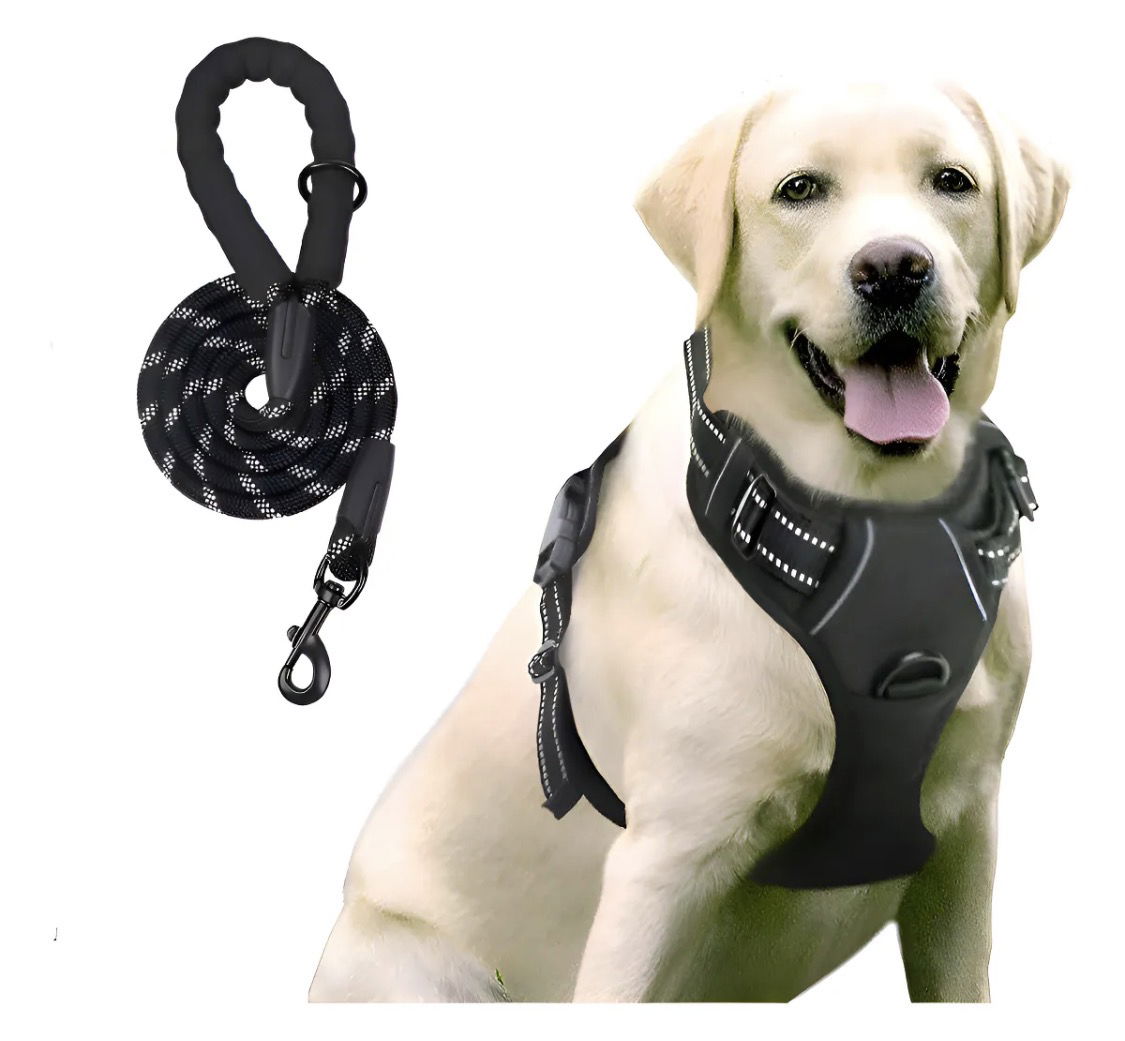 El arnés distribuye la presión de forma equilibrada sobre el cuerpo, evitando tensiones en el cuello y permitiendo movimientos naturales. La correa resistente, con agarre cómodo, acompaña cada paseo con firmeza y tranquilidad.